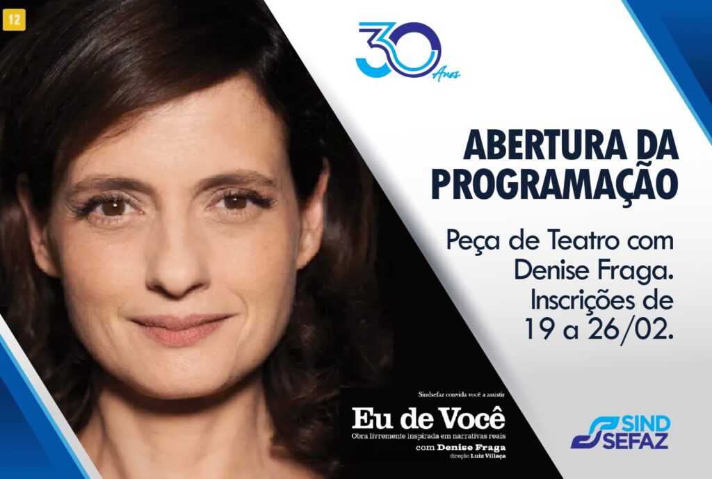 A peça “Eu de Você” marca apenas o início de uma programação extensa, preparada especialmente para os associados do Sindsefaz, que será realizada ao longo dos fins de semana do mês de março. Além da apresentação estrelada por Denise Fraga, a agenda comemorativa inclui sessões de cinema, entre elas a exibição do premiado filme “O Agente Secreto”, um seminário de debates com temas de grande relevância para a categoria e, encerrando as comemorações, a grande festa dos 30 anos, com shows de Luiz Caldas e Xande de Pilares.