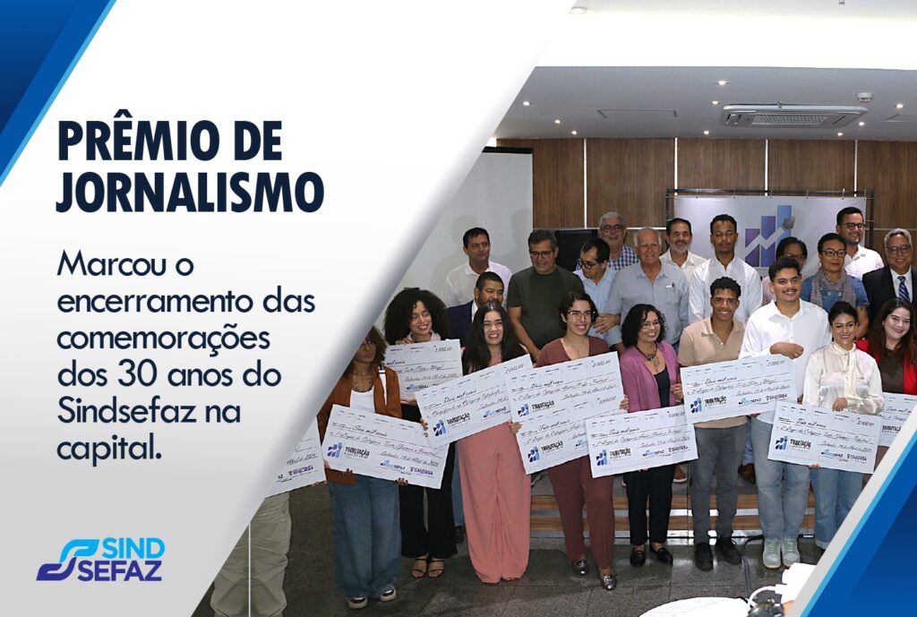 O Sindsefaz anunciou os vencedores do Prêmio de Jornalismo “Tributação e Justiça Social”, em cerimônia realizada na noite desta (14), em Salvador. O evento reuniu jornalistas, estudantes, representantes institucionais e lideranças sindicais em um momento de valorização da produção jornalística comprometida com o interesse público. A iniciativa foi promovida pelo Sindicato, em parceria com o Sinjorba, o Sindicato dos Jornalistas, marcando o encerramento das comemorações pelos 30 anos do Sindicato.