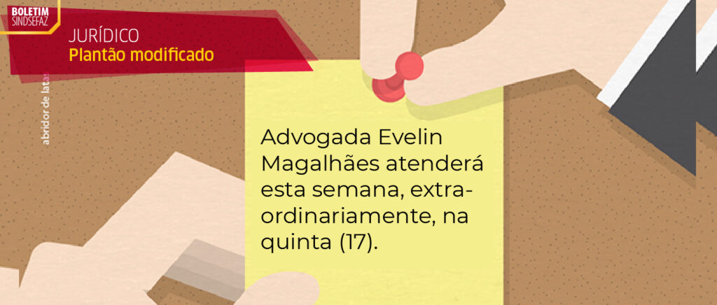 O Sindicato avisa a todos os associados que a nossa advogada, Evelin Magalhães, não poderá fazer o atendimento normal aos associados nesta segunda (14), como é de praxe. O plantão será transferido extraordinariamente esta semana para a quinta (17), no mesmo horário, das 9h às 12h.