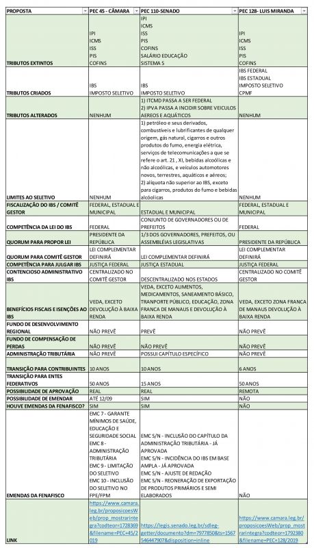 Veja abaixo vai um quadro sintético-comparativo das propostas avaliadas.